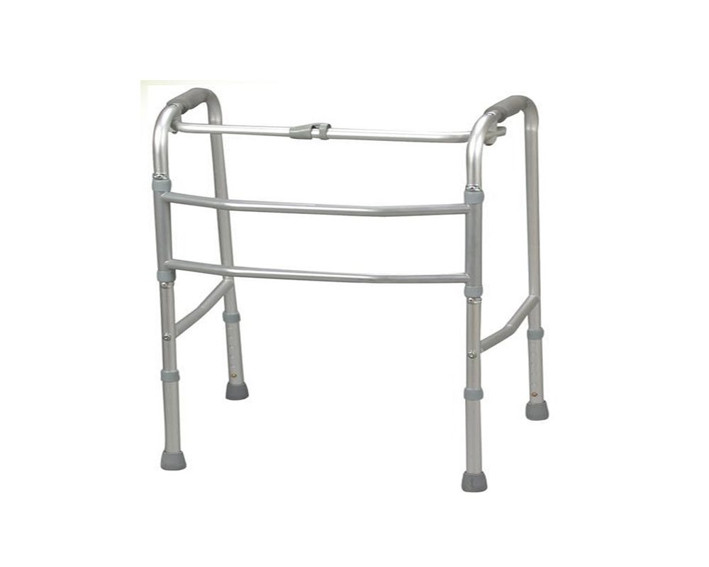 Andadera caminadora reciproca de aluminio anodizado color Plata, con ajuste de altura, agarraderas y soportes antideslizantes.